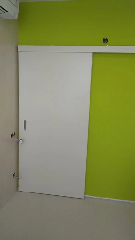 Откатная система удобна для рентген-кабинетов и КТ-отделений с ограниченным пространством, поскольку полотно уходит вдоль стены и не требует зоны распахивания. Полотно собирается на основе алюминиевого профиля с порошковой окраской, с обеих сторон облицованного ламинированными МДФ-панелями. Внутри размещаются свинцовые листы, обеспечивающие необходимый эквивалент свинца от 0,5 мм до 2,0 мм Pb, в зависимости от расчетной нагрузки по излучению.