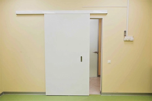 Рентгенозащитные откатные двери формируют непрерывный экранирующий контур по периметру проема, что позволяет минимизировать утечки излучения через стык полотна и стены. При правильной установке и герметизации контура достигается заданный уровень защиты персонала и пациентов, находящихся за пределами зоны облучения. Откатной механизм обеспечивает быстрый доступ в помещение и не создает помех для перемещения каталок, диагностического оборудования и вспомогательных тележек.