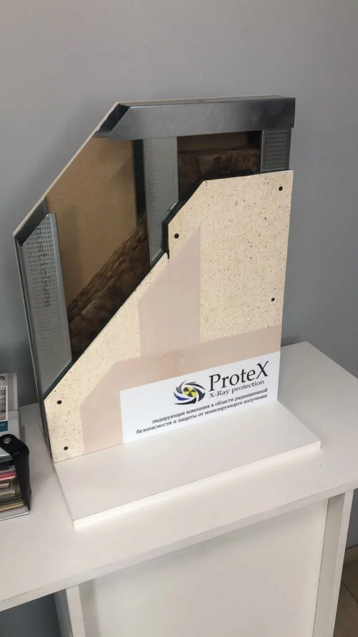 Панели представляют собой комбинированный рентгенозащитный элемент: баритонаполненный радиационно-защитный слой жестко соединен с негорючим стекломагниевым листом. Такое исполнение позволяет одновременно обеспечивать требуемый свинцовый эквивалент по защите от излучения и выполнять функции строительной облицовки или перегородки без дополнительной подосновы. Продукция ООО «ProteX» поставляется с протоколами испытаний и сертификатами соответствия требованиям, предъявляемым к рентгенозащитным строительным материалам, и не содержит токсичных компонентов в составе.